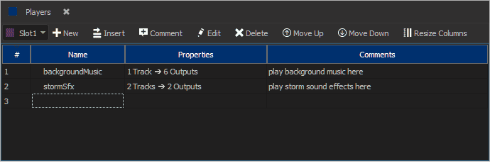 A player name can be any valid resource name. The name is used for playback events events such as: Play, Stop, Pause, Set Mix, and Dim.