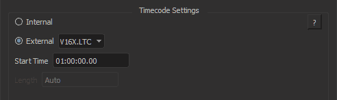 The timecode value can be internally controlled and incremented by the sequence or externally controlled from another source (i.e. SMPTE LTC Interface)