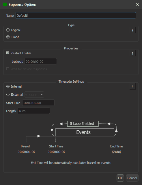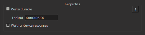 If Restart Enable is checked, a playing sequence will react to play events and triggers by restarting from the position specified by the play event. The lockout time specifies how long play events and triggers will be ignored once the sequence starts playing. If the lockout time is 0, the sequence will immediately allow Play events to restart playback.