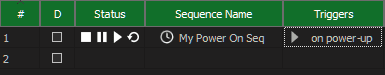 Triggers make it easy to play and stop sequences automatically. For example, a sequence can begin playing automatically when the controller powers on. Find more information on the Triggers page.